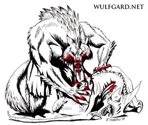 | + | [[File:Tomwolf_eating_wyvern.jpg|thumb|300px|The [[Tom Drake|Beast of Illikon]], a [[Werewolf|werewolf]], devouring a wyvern.]]Wyverns are fearsome predators. Though not often seen today, they occasionally dwell in the high cliffs of the [[Jagged Edge Mountains]] and descend in small families or larger flocks in search of food. They are especially fond of herds of cattle or sheep. It is not recommended, dear reader, to imagine you might slay a wyvern. Such acts are only undertaken by the [[Venatori]] and perhaps select few other great warriors. Wyverns often do battle with dragons and giants in the mountains, and occasionally other, larger predators of the realm will also devour them, and wyverns continue to prefer acting as scavengers rather than predators. | ||