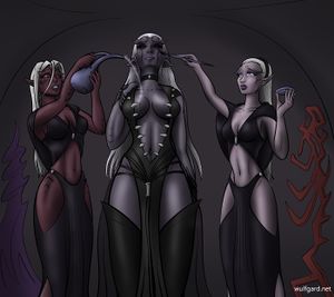 Handmaidens Raevia Vael (pale skin) and Aeluria Bel'ord (red skin) prepare their mistress, Lady Varylys, for a ritual.