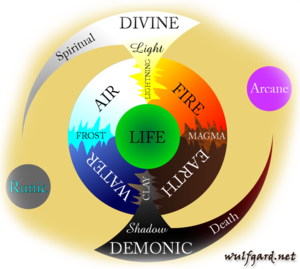 Although Life is in the very center of the Wheel of Magic, it is not considered a Discipline of Magic, because it is utilized for healing purposes by a variety of spellcasters, including Priests, Shamans, and Druids. Life in the mortal realm is granted by the balanced combination of the four elements. By balancing these elements in the body (through warmth, liquids, food, etc.), a healer can cure ailments through non-magical means. This can also be done magically with healing spells, which can also aid in the regeneration of wounded living things. Life magic can never do harm, except to the undead.