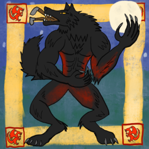 Very recently, the city of Illikon came under siege by barbarians from Northrim, and one of the most heroic knights of the Northwest became a great werewolf of black and crimson. The Beast of Illikon, as the monster has thus been named, decimated the attacking armies with its insatiable bloodlust. With a howl, it summoned the aid of many other werewolves and wolves, sparking transformations and thus loyalty even among the enemy, creating its own army of wolf-beasts.